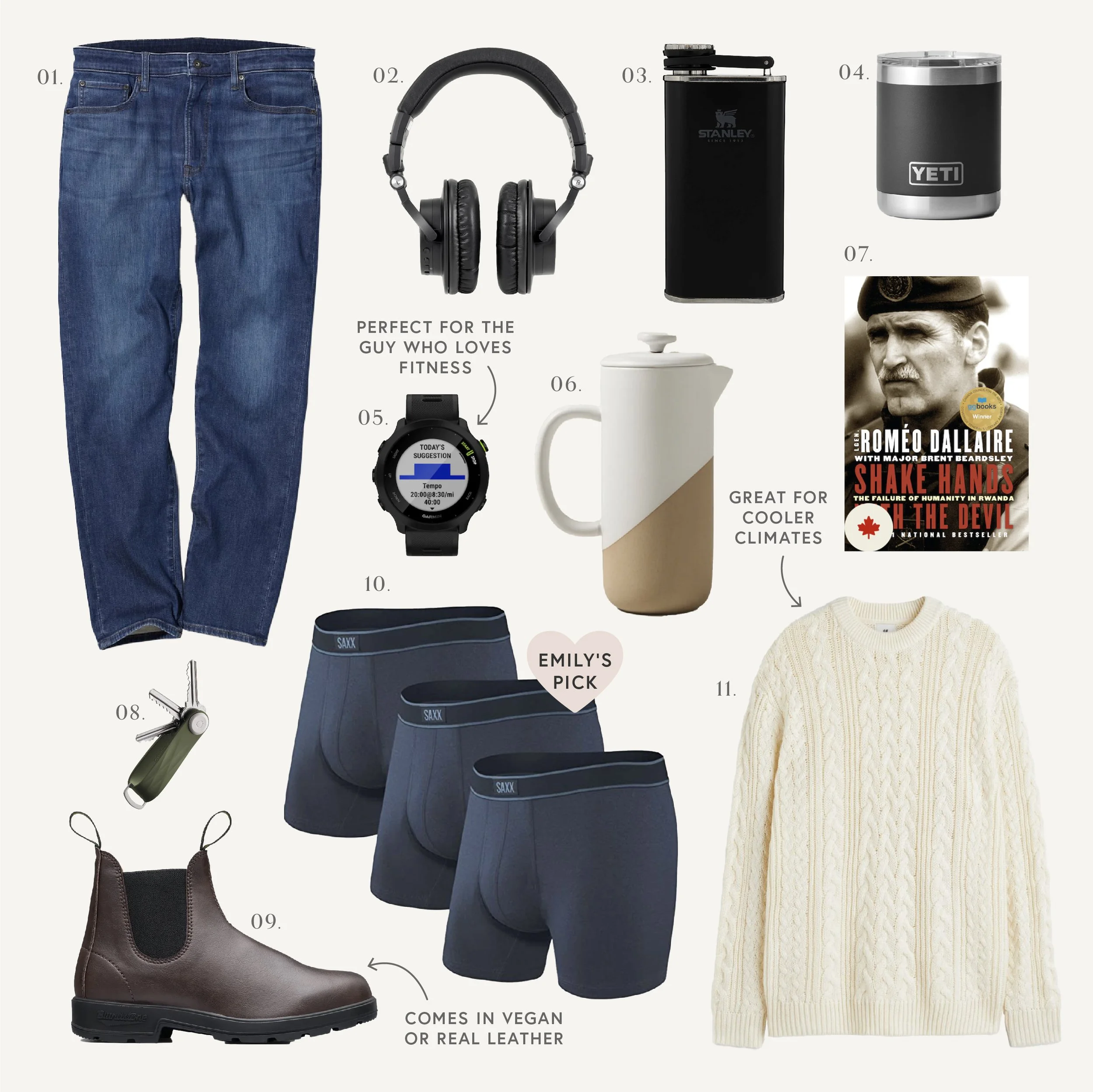 01. Sweat Pant Jeans | 02. Noise-Cancelling Headphones | 03. Stanley Flask | 04. Yeti Whisky Glass | 05. Smartwatch | 06. Stoneware French Press | 07. Shake Hands With The Devil | 08. OrbitKey | 09. Blundstones | 10. Saxx Underwear | 11. Sweater