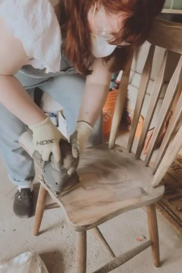 Using a damp cloth, I quickly wiped down the chairs to remove any dirt or dust, allowed it to dry completely and then started the sanding process. I ended up using a combination of a palm sander for the seat, as well as hand sanding the legs and spindles since those were primarily round and hard to get the palm sander between them. I will say, this was the most tedious part of the process, and my arms were quite sore after, but it was a very rewarding feeling when it was complete.