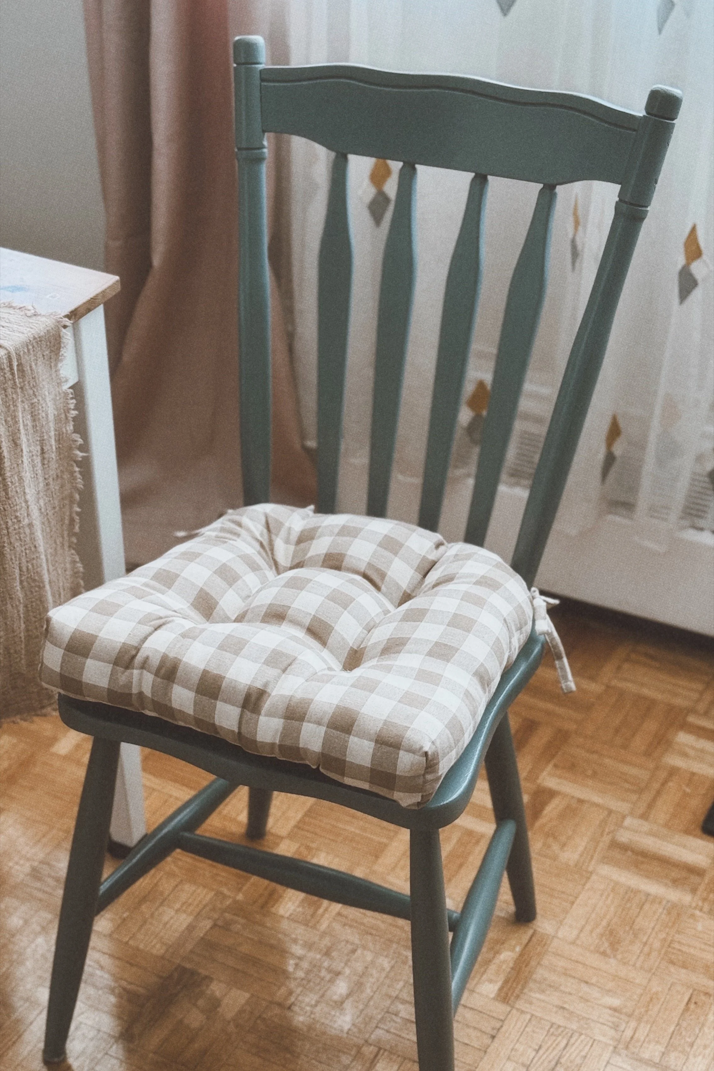 To finish off the look of these chairs, since I love a farmhouse-cottage home decor style, I ordered some gingham tufted chair cushions in a warm brown tone that also protects the seat from damage. Overall, I’m so happy with how these turned out, and they were ultimately a lot cheaper than purchasing new solid-wood dining chairs. I’m hoping in the future I’ll be able to find a wooden dresser, or armoire to add to our living room, and I’d love to share that journey with you as well!