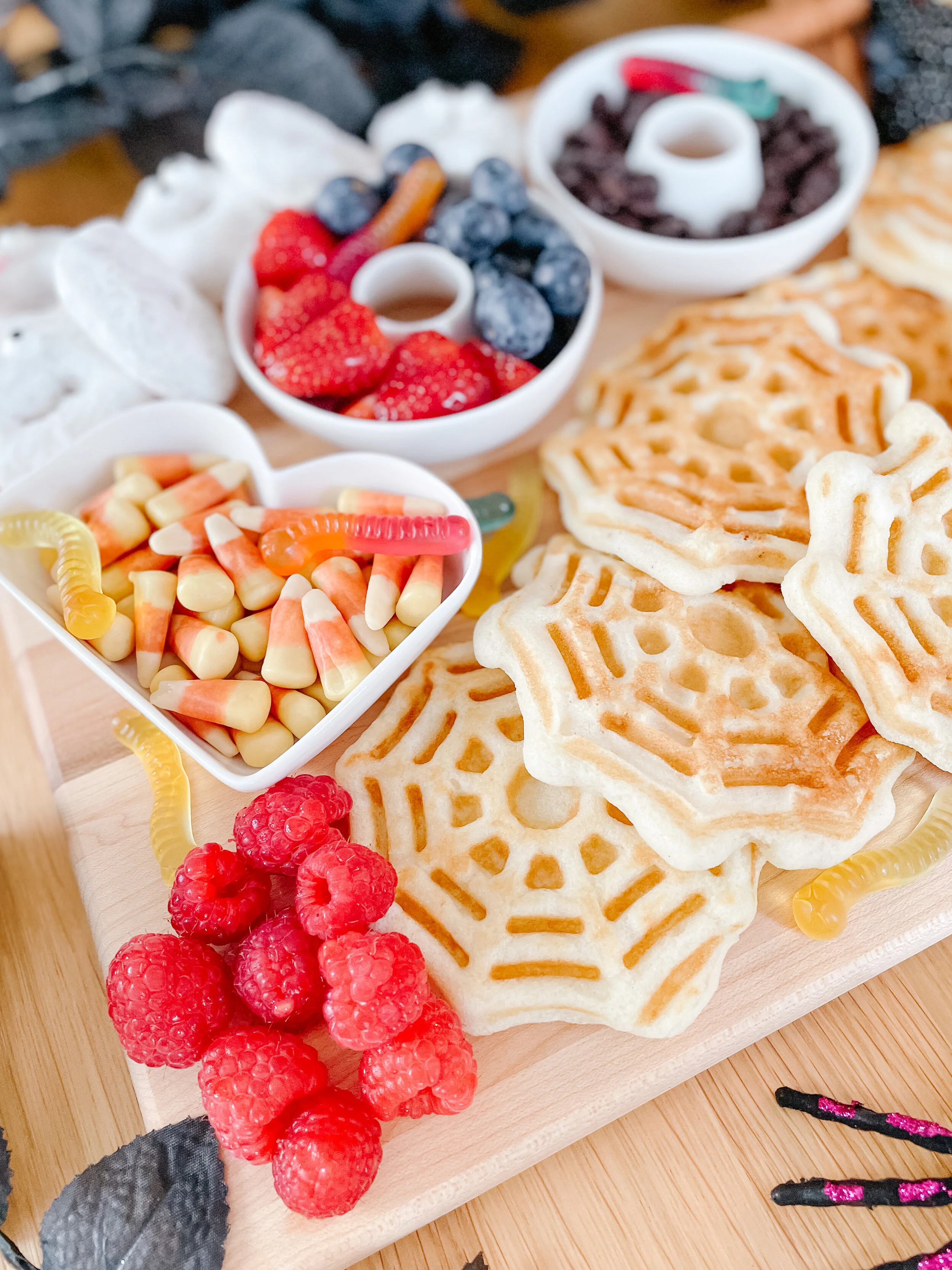 The next item I find the easiest to place is the largest food that will be on the board, which in my case, are mini waffles in the shape of spider webs & pumpkins. Once I get them in place and how I want them, I move onto the next item which is ghostly bananas with chocolate chips for eyes & a mouth. Regardless of what your “large” food items are on the board, place all of those at this point, and then move onto the smaller things.