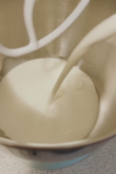 - Pour the litre of whipping cream into your mixing bowl, and set to medium speed.