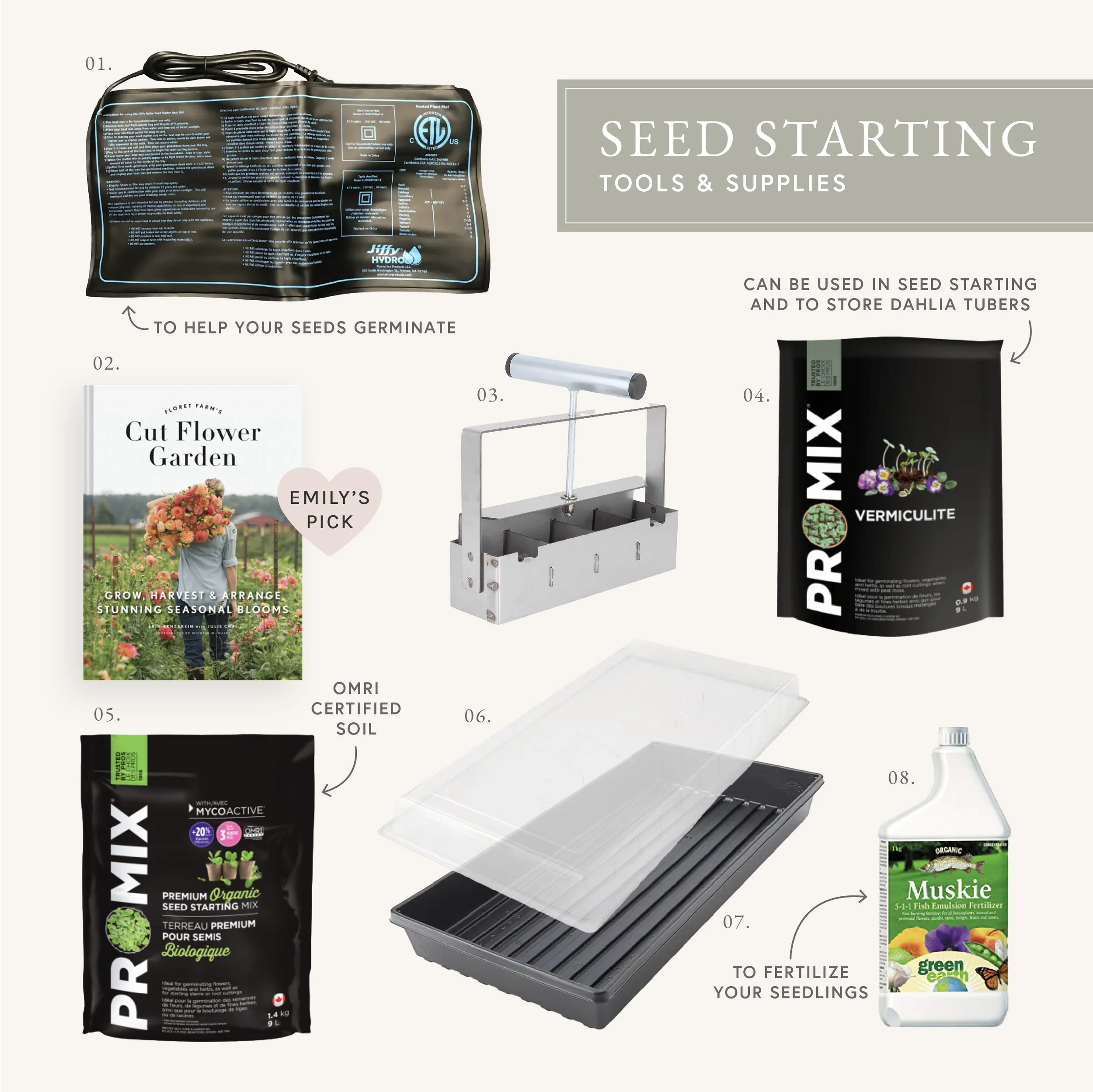 01. Heat Mat | 02. Cut Flower Garden | 03. Soil Blocker | 04. Vermiculite | 05. Organic Seed Starting Mix | 06. Tray Lid | 07. Seed Starting Tray | 08. Fish Emulsion
