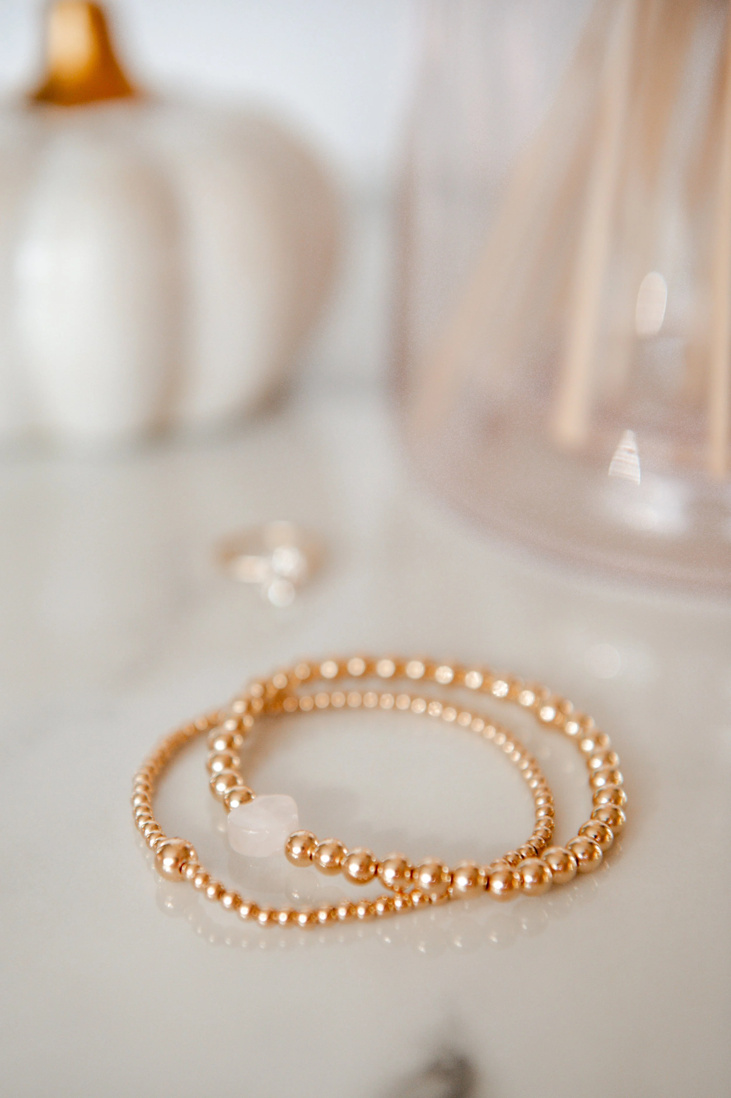 Last, but certainly not least, are two of my latest, everyday pieces of jewelry, the rose quartz heart bracelets that were an add on in the fall Jilly Box (safe to say that I loved the Fall 2021 Jilly Box, huh?). I’m not kidding when I say I wear these every single day now — they’re so beautiful and neutral, and don’t make annoying noises hitting my desk or keyboard throughout the day.