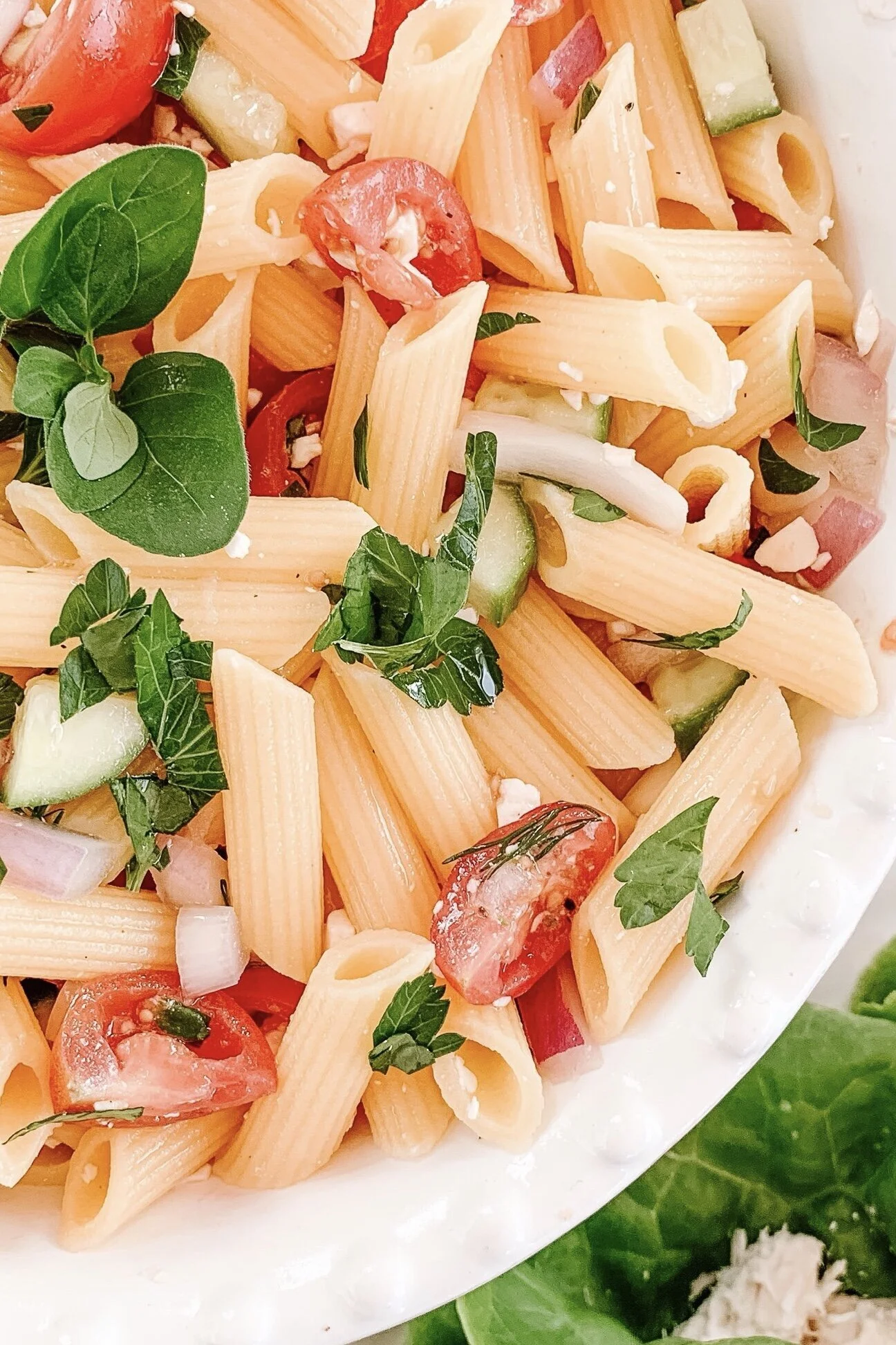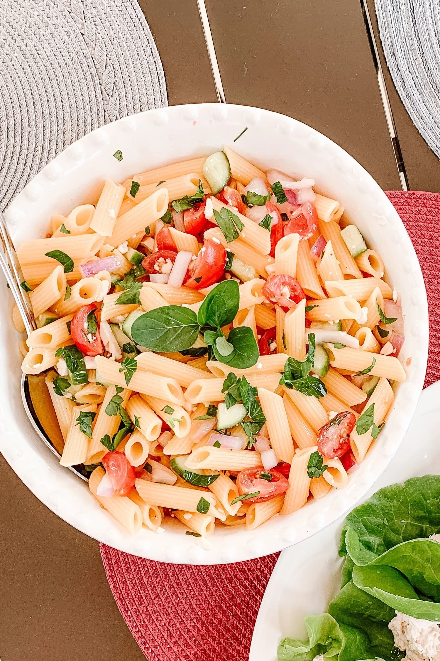 - In a mason jar, or any jar with a tight seal, combine your olive oil, lemon juice & red wine vinegar to taste; shake vigorously until well combined. When well combined, pour the liquid over pasta, add in the chopped herbs, vegetables, crumbled feta cheese, salt & pepper and toss until pasta is well coated & vegetables are equally mixed in. Garnish the serving bowl with some whole basil leaves on top. Place in the fridge for a few hours to get the pasta salad nice and cold.