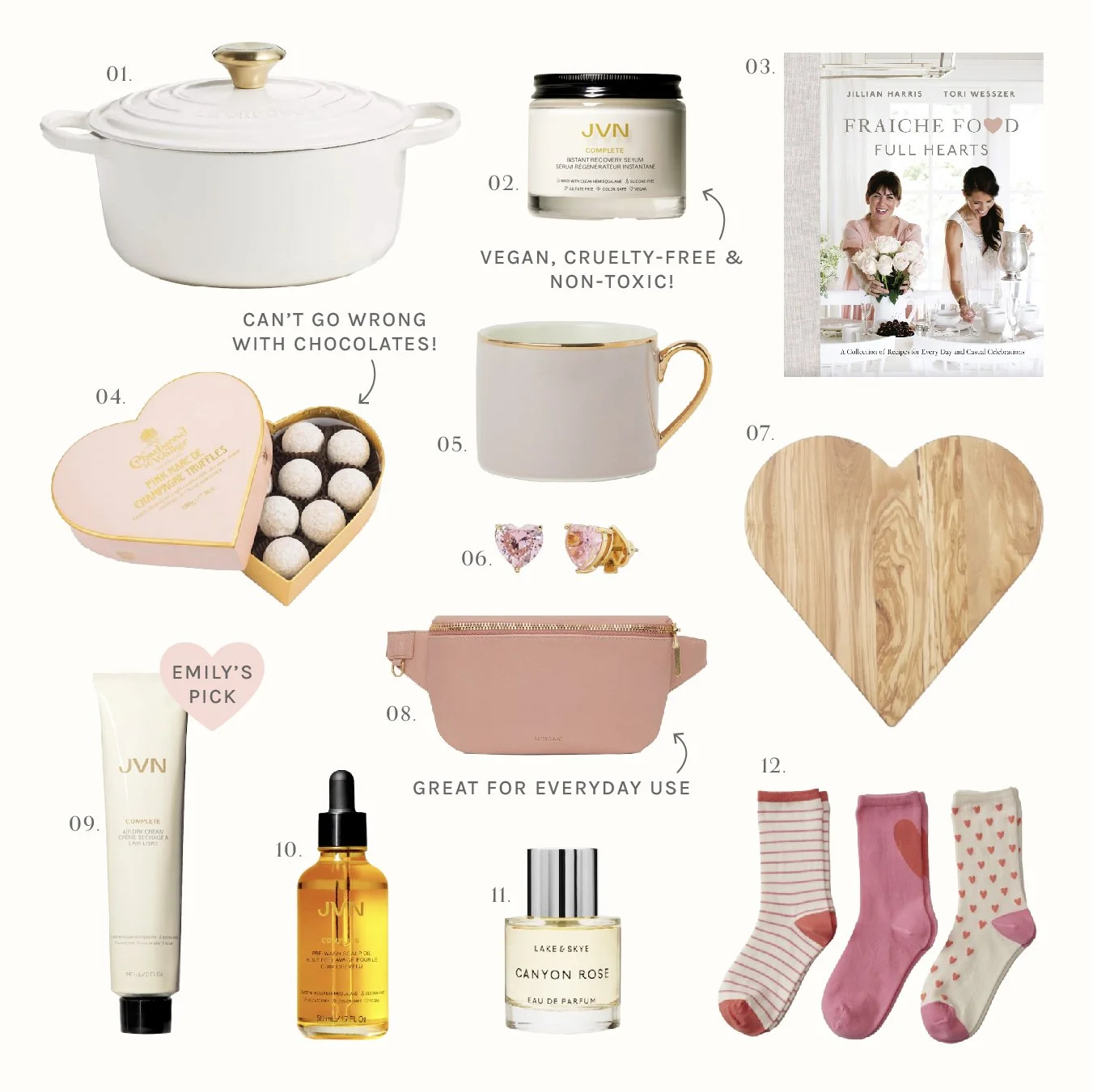 1. Round Dutch Oven | 2. Instant Recovery Serum | 3. Fraiche Food Full Hearts | 4. Champagne Truffles | 5. Mug | 6. Earrings | 7. Wooden Heart Board | 8. Belt Bag | 9. Air Dry Cream | 10. Scalp Oil | 11. Perfume | 12. Socks